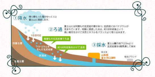 採水地は山梨県富士河口湖町(ふじかわぐちこまち)の、業界で最も高い標高1,030m地点です。